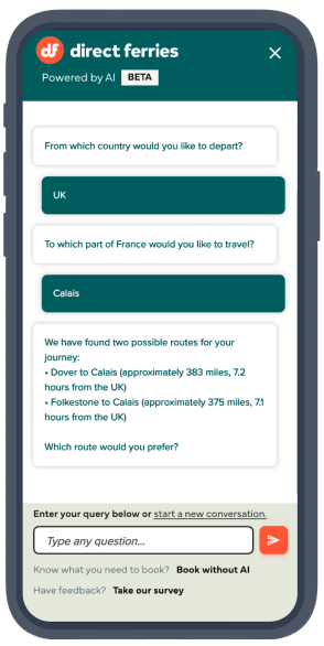 - Deployed directly into the Direct Ferries landing page and existing APIs for smooth adoption.
