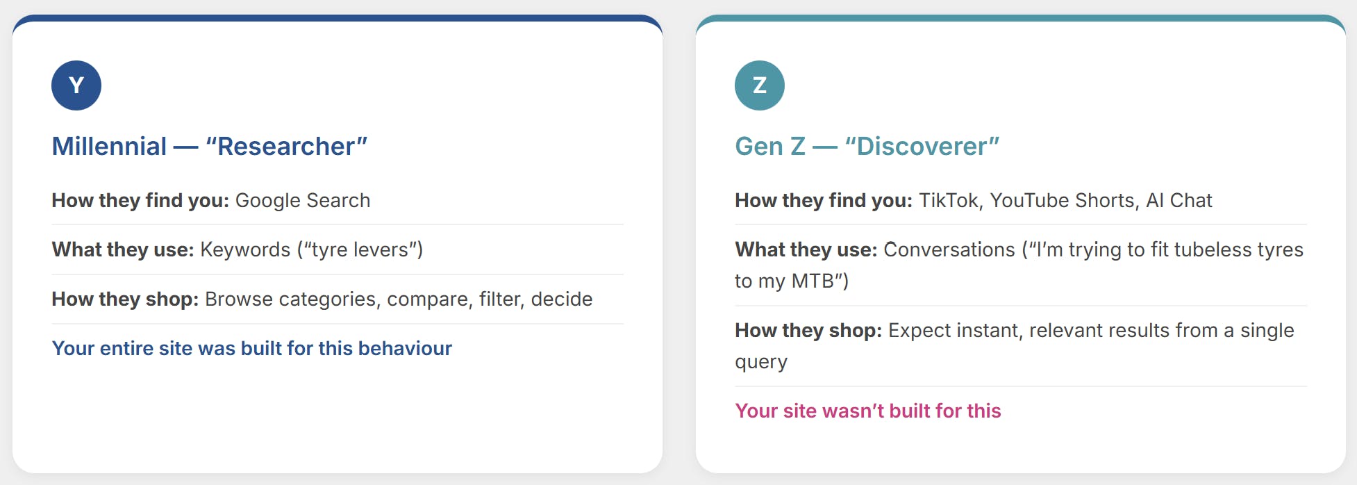 Generation Z, on the other hand, is a generation of "Discoverers." They find products through TikTok, YouTube Shorts, and AI chat. They have conversations instead of typing keywords.